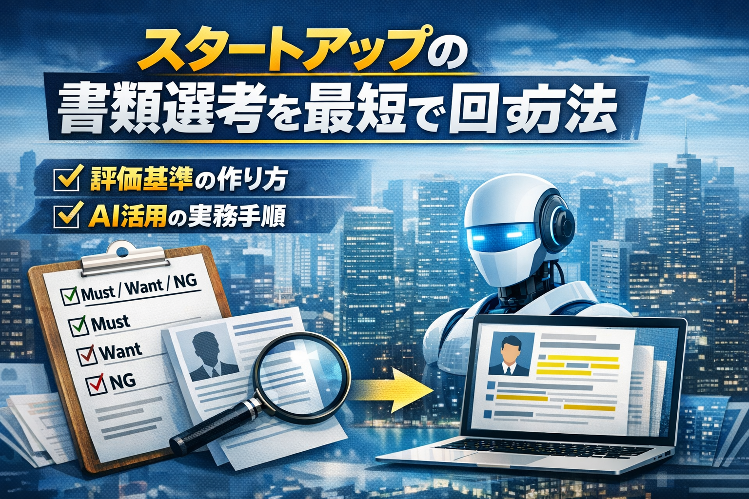 スタートアップの採用はスピードが命です。一方で、書類選考が特定の人に集中し、基準が人によって揺れたり、面接まで進める候補者の質が安定しないケースは少なくありません。「急いで見るほど判断が雑になる」「丁寧に見るほど採用が遅れる」という板挟みを解消するには、評価の設計と運用の型化が欠かせます。